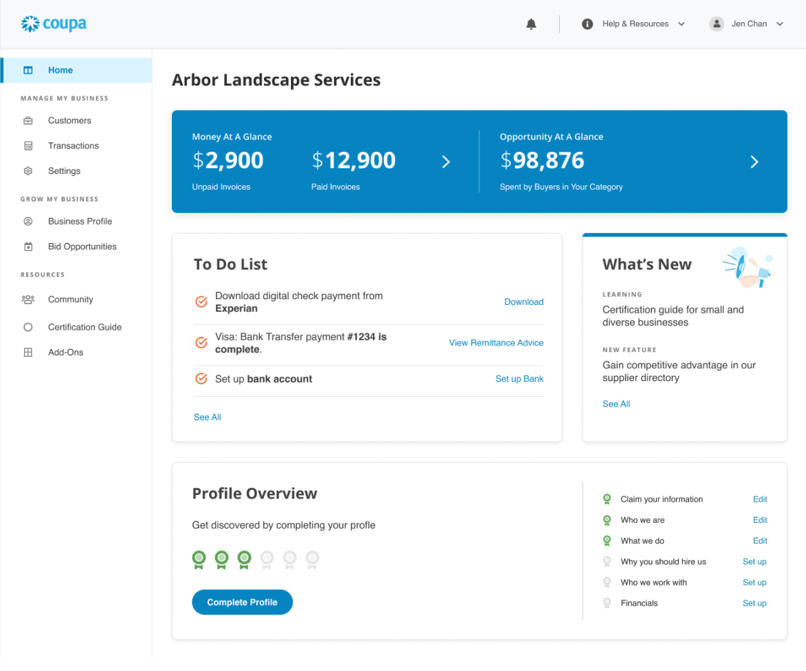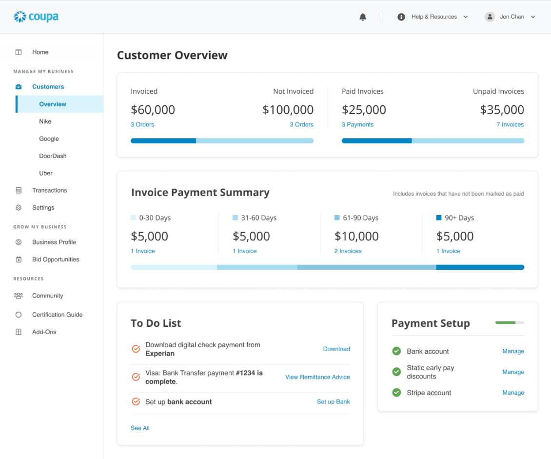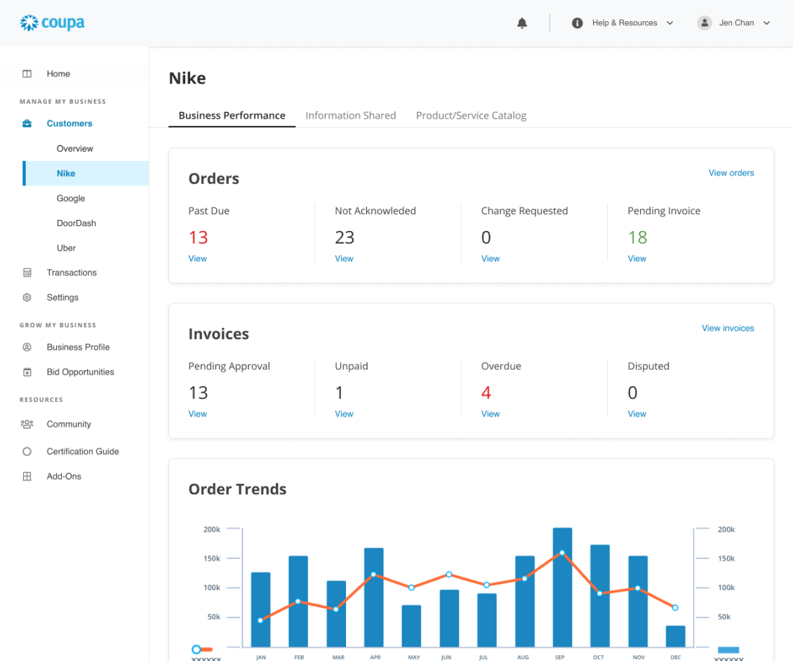 Suppliers are able to view pending orders, invoices, and payments, and requests for updated information from their customers, all in one place.